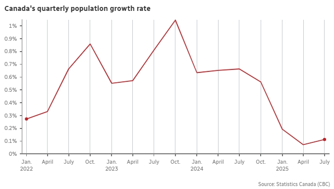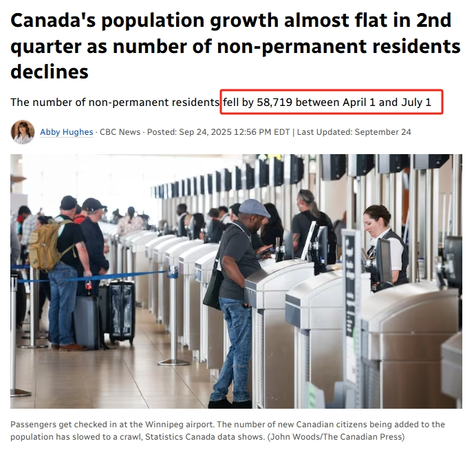 根据加拿大统计局最新数据显示,2025年第二季度加拿大人口增速几乎为零,与年初的情况类似。