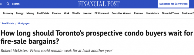 如果你是正考虑入手多伦多供应过剩公寓的潜在买家,你自然不想“接飞刀”。那么,什么时候这把刀才会停下?