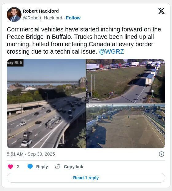 有记者在社交媒体上分享了边境口岸卡车大排长龙的景象,并写道:“商用车辆开始在布法罗的和平桥上缓慢前行。卡车排了一上午的长队,由于技术故障,在每个过境点都无法进入加拿大”。