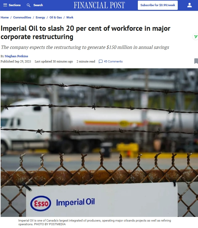 据《财经邮报》报道,加拿大帝国石油公司表示,将裁减 20%员工,作为重大企业重组计划的一部分。公司称此举将在 2028 年实现每年 1.5 亿加元的节省。