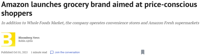 周三,亚马逊宣布推出全新自有杂货品牌“Amazon Grocery”,专为“价格敏感型”消费者打造,大多数商品价格都低于5美元。
