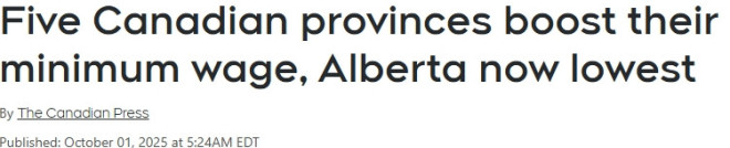 阿尔伯塔省是唯一没有上调最低工资的省份,其每小时15加元的水平如今成为加拿大最低。