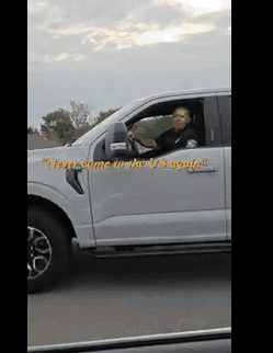 这段39秒的视频中,这名据称是美国边境官员的人坐在一辆灰色皮卡车里,从车窗向外对该司机大喊大叫。当他注意到摄像头后,立即加速超过该司机,从车道上超车驶离。