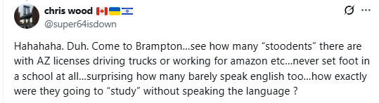 “哈哈哈,是真的。来宾顿看看就知道,有多少‘留学生’拿着安省驾照开卡车,或者在亚马逊等地方打工……根本没踏进过学校一步……更令人惊讶的是,很多人的英语都很差……他们不会英语,又怎么可能去‘学习’呢?”