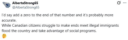“我想说,这个数字(4.7万)末尾加个0可能更接近实际情况。当加拿大公民辛苦维持生计时,非法移民却大量涌入,并利用社会福利制度。”