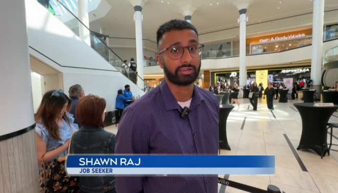 在他后面几个人的位置上,另一名男子插话说,他当天早些时候还参加了多伦多的另一场招聘会。