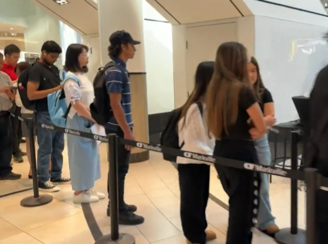 成百上千的人在Markville购物中心中庭排队数小时,希望能被参加招聘会的众多雇主录用。他们一批又一批地排着长队,肩并肩站着,被围栏围绕在万锦市Markville购物中心的中庭周围。