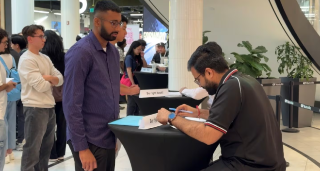 Telha Yousaf在招聘会队伍中抢到了靠前的位置。