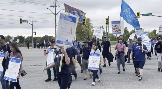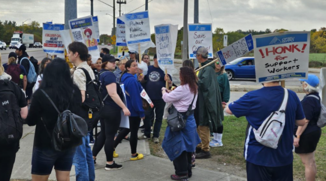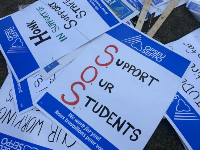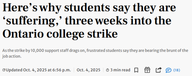 随着安省公共服务雇员工会(OPSEU)超过1万名全职学院支援员工罢工进入第四周,全省24所公立学院陷入混乱。