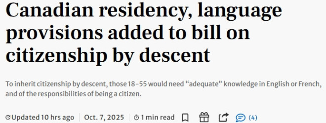 未来,如果你出生在海外、父母也出生在海外,即便家中有“加拿大籍”,也不能轻松继承——必须像普通移民一样,符合语言、知识和安全要求。