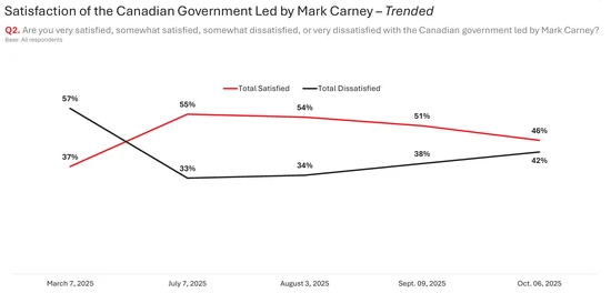 另一份Abacus Data于10月5日发布的民调也显示,公众对卡尼及其政府的好感持续下降。目前只有46%的受访者表示认可卡尼政府,比夏季高峰时的53%明显下滑。