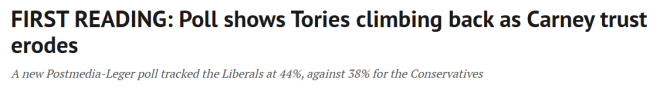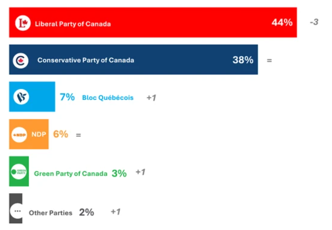 根据《邮报传媒》(Postmedia)与Leger联合发布的最新调查,自由党支持率为44%,保守党为38%。