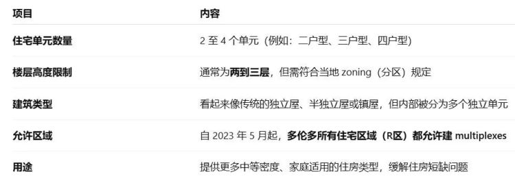 为了应对住房短缺,多伦多市政府在2023年修改了分区条例,允许在原本只能建造单户住宅的低密度社区中兴建 Multiplex。