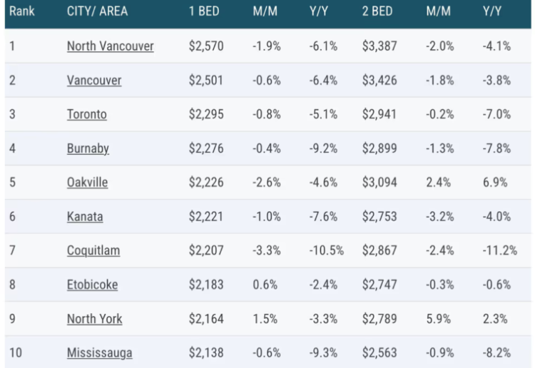 Rentals.ca 表示:“温哥华和多伦多的公寓租金在过去两年分别下跌了 15% 和 10.1%,三年内分别下跌了 9.7% 和 2.2%”。