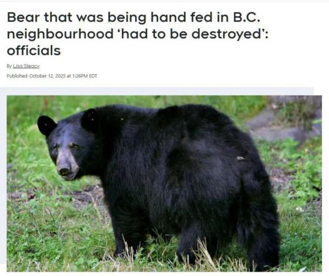 BC省自然保护官员服务处写道:“由于这居民喂养了熊的家庭,直接导致母熊必须被杀死,两只幼崽被带到康复中心,以便明年春天重新安置”。