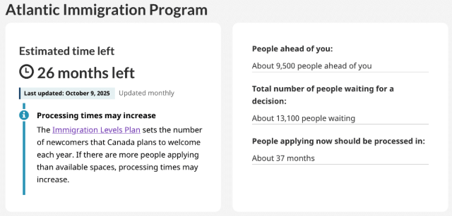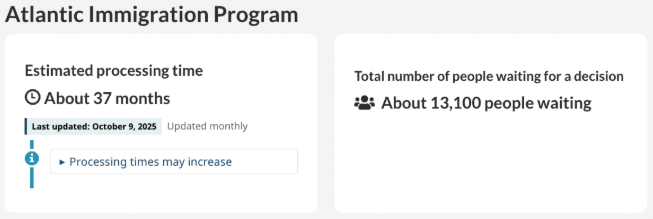 举例来说,申请人Sally 2025年5月通过大西洋移民计划(AIP)递交了移民申请。现在是10月,她想查进度,显示结果如下: