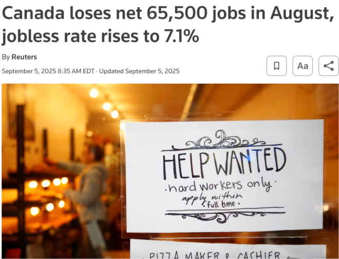 加拿大有七成出口靠美国,结果美国8月只新增2.2万个工作岗位,远低于市场预期的7.5万。而且之前的6月数据被反复下修,从最早的14.7万,到最后变成负1.3万。
