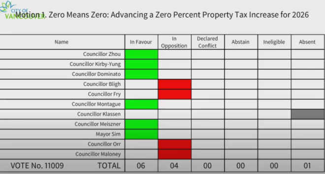 随着该动议的通过,市议会将指示市政府工作人员根据零房产税增长来编制温哥华 2026 年的运营预算,并承诺“探索一切方案来减轻纳税人的负担,控制支出,并实现平衡的运营预算”。