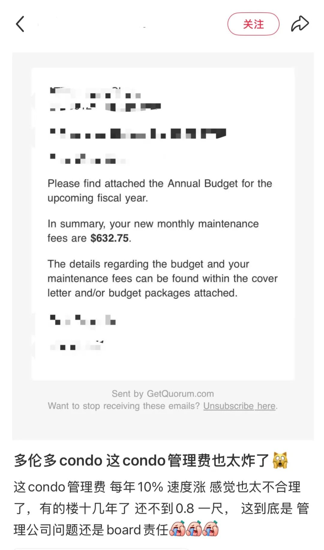 “多伦多 condo 这 condo 管理费也太炸了!这 condo 管理费每年 10% 速度涨,感觉也太不合理了,有的楼十几年了还不到 0.8 一尺,这到底是管理公司问题还是 board 责任。” 瞧瞧这吐槽,满屏都是无奈。
