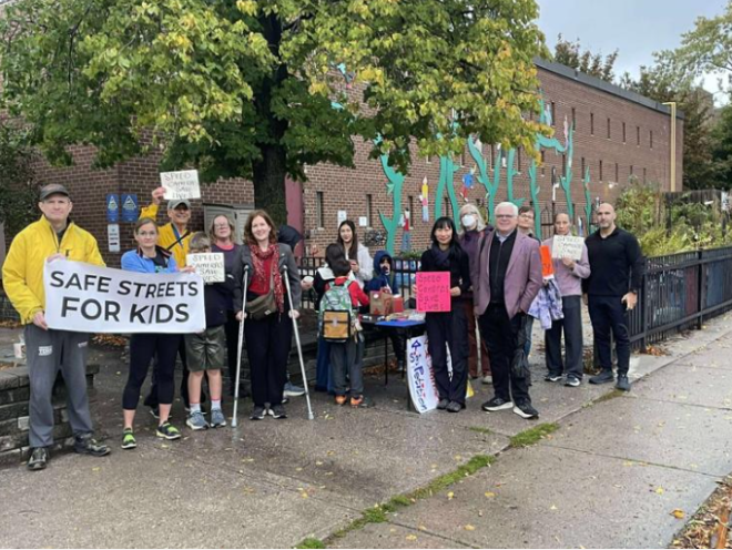 在东约克,家长和孩子们聚集在William Burgess小学外,高举标语,呼吁省长福特(Doug Ford)重新考虑撤销限速摄像头的计划——他们认为,这项措施能有效保护学校区域内的儿童安全。