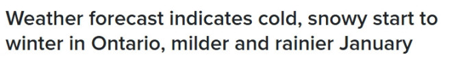 综上所述,11月至1月间,安省南部预计会经历异常的大量降雪与超级低温天气。