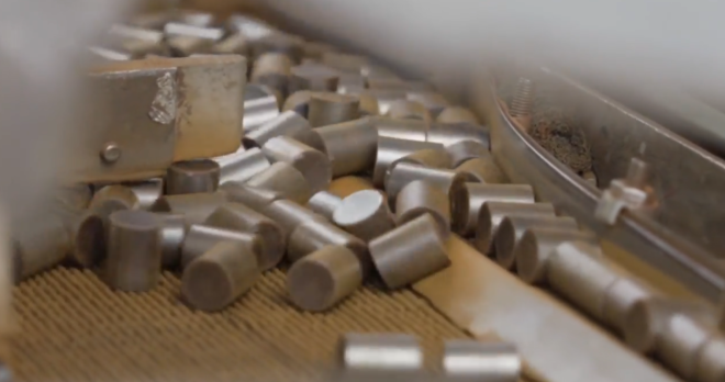 记者在Jack Chong的带领下参观了生产流程。原材料来自萨省卡梅科(Cameco)公司的铀矿,运抵工厂后被压缩、研磨,再与硬脂酸锌混合(起润滑作用以减少摩擦)。接着,粉末被送入旋转造粒机,通过机器人压机压成重约20克的铀颗粒——大小仅为一节AA电池的四分之一。