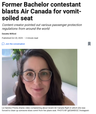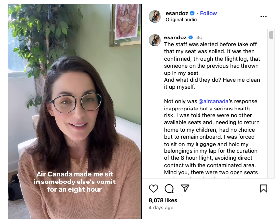 前《The Bachelor》参赛者、现任内容创作者 Liz Sandoz Presta 最近在社交媒体怒发视频,称自己在乘坐加拿大航空(Air Canada)国际航班时,被强迫坐在一位乘客呕吐过的座位上整整8小时!这段痛苦经历曝光后,迅速引发了舆论风暴……