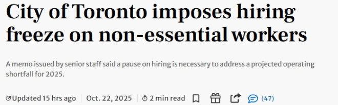 市政府今天(10月23日)正式宣布——即日起全市范围内实施“非必要岗位招聘冻结”,至少维持到2026年初。这意味着,除紧急与关键服务外,多伦多市政系统几乎全面暂停招聘。