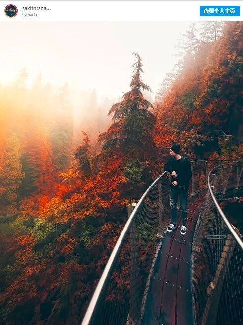 位于北温的Capilano吊桥公园是秋季必游之地,拿杯热咖啡,步行穿过吊桥,让秋叶拥抱你。