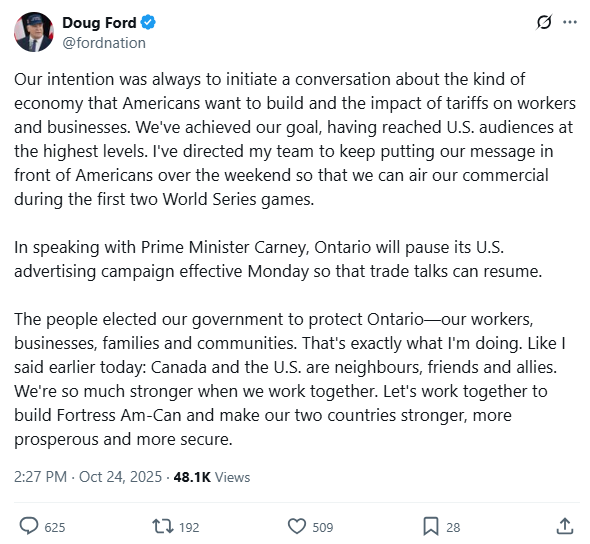 此前,尽管川普表示计划因安大略省在美国的反关税广告宣传而停止与加拿大的贸易谈判,但省长福特拒绝退缩。