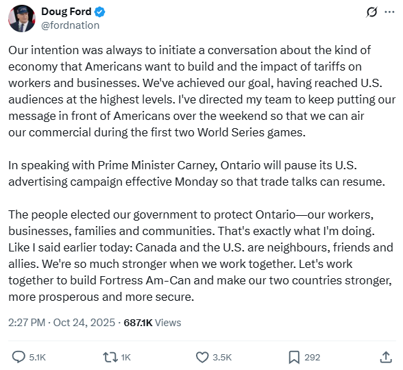 这一宣布是在川普叫停与渥太华的贸易谈判一天后作出的——此前,加拿大在美国电视上播放了批评他关税政策的广告。