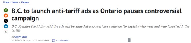 加拿大BC省计划推出自己的反关税广告——即便安省已经暂停了类似的宣传活动,此前美国总统唐纳德·川普取消了与加拿大的贸易谈判。