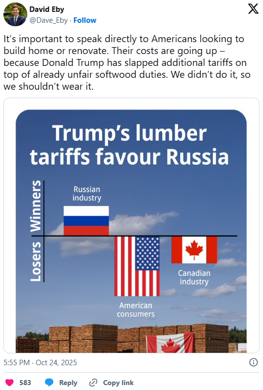 “他们的成本正在上涨——因为唐纳德·川普在原本不公平的软木关税上又加了新税,”他写道。“这不是我们造成的,我们不该为此埋单。”