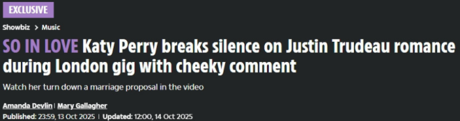 随后,在佩里的伦敦演唱会上,有粉丝单膝跪地求婚,她俏皮回应说:“我真希望你能在48小时前问我这个问题。”