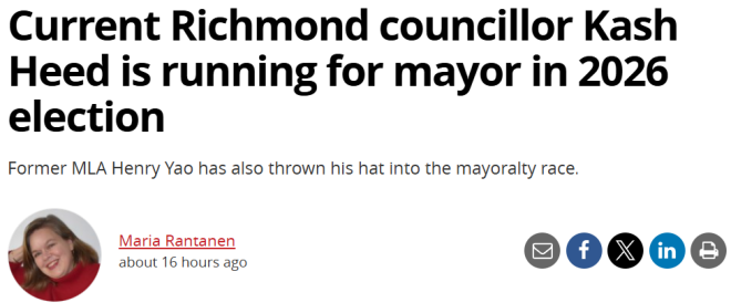 目前,市议员Derek Dang已经公开支持他,两人还成立了“列治文崛起”(Richmond Rise)团队参与竞选。
