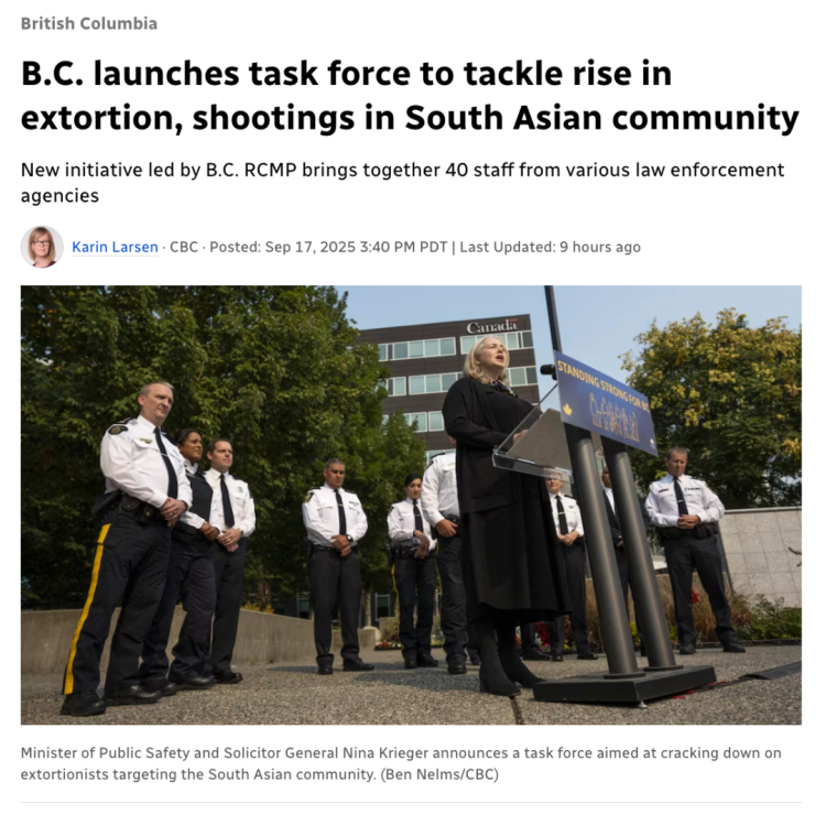 卑诗省皇家骑警(RCMP)牵头成立了一个新的省级特别小组,以应对针对南亚裔社区日益增多的勒索威胁和枪击事件。