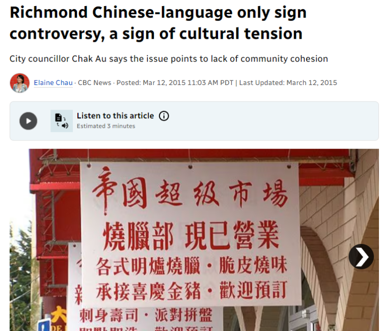 纯中文广告、标牌事件,在加拿大曾经闹大过,就连加拿大官媒都曾点名批评 —— 十年前发生在列治文,一些移民较早的大温华人应该有所耳闻。