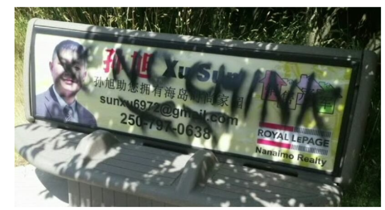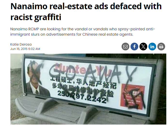最严重的一起发生在温哥华岛第二大城市Nanaimo:多个公交站的亚洲地产经纪广告被人恶意涂鸦,当地警方将其定性为种族歧视。