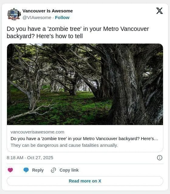 温哥华有一些树木——它们看起来像普通的树木,但这种外表健康所谓的“僵尸树”却暗藏死亡风险,可能带来即时威胁。