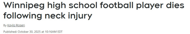 温尼伯教育局(Winnipeg School Division)证实,当地Sisler高中一名12年级学生因在本月初一场橄榄球比赛中受重伤,于本周三晚间不幸去世。