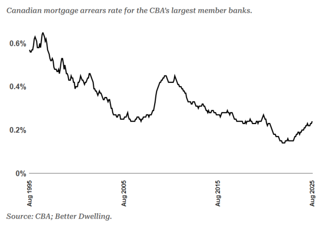 加拿大抵押贷款拖欠率在2022年中降至创纪录低位0.14%。到2025年8月,已升至0.24%,不到三年时间增幅达71%,标志着自全球金融危机以来的最快增速。