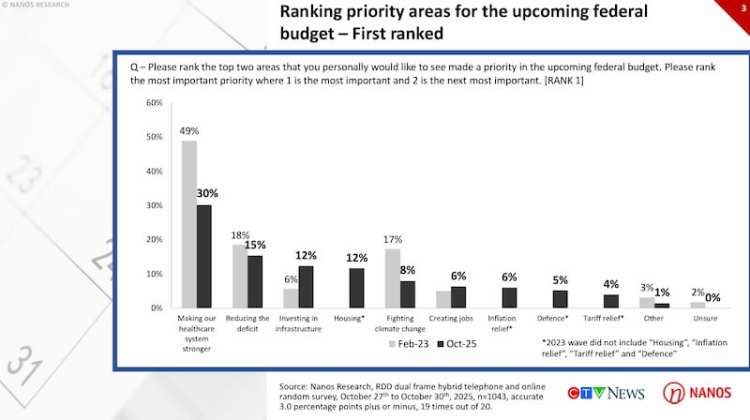 当被问及加拿大人希望联邦预算优先考虑的两个领域时,医疗保健仍是首位,有30% 的受访者将其列为最重要议题。