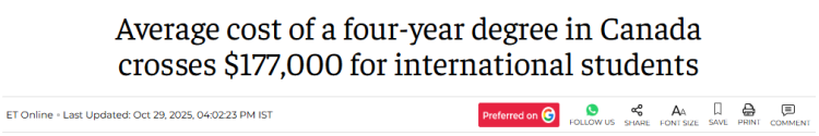 数据显示,在加拿大攻读一个四年制本科学位,仅学费成本就超过177.000加元;而两年制的研究生项目平均不到50.000加元。