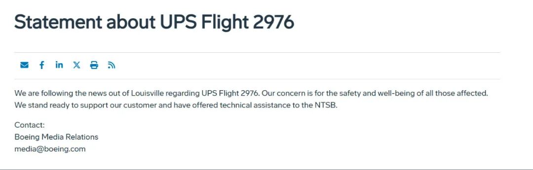 波音公司也发表声明称:“我们将为UPS与NTSB提供技术支持,目前的重点是所有受影响人员的安全与福祉。”