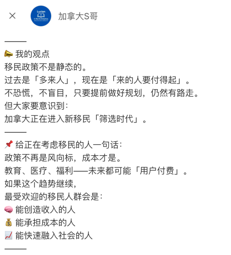 小红书博主“加拿大S哥”的评论一语中的:“移民政策不是静态的。过去是“多来人”,现在是“来的人要付得起”。不恐慌,不盲目,只要提前规划,仍然有路走。但大家要意识到——加拿大正在进入新移民『筛选时代』。”
