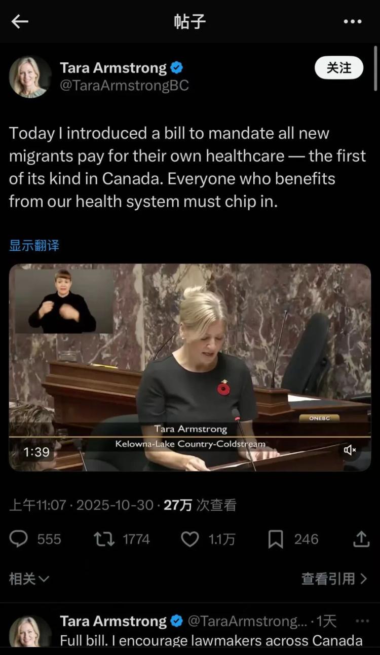Tara Armstrong的提案,是加拿大政坛首次把“新移民医疗自费”正式写进议会记录的案例。