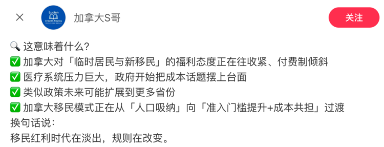 过去,加拿大以“福利友好”著称,移民在落地后只需等待数月即可纳入公共医保体系。而如今,“享受之前先付费”的逻辑正在崛起。
