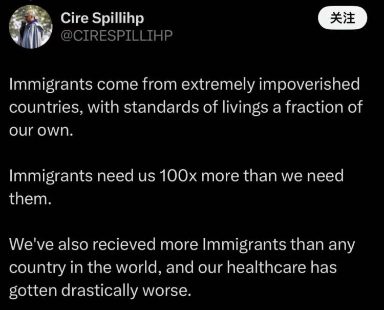 一部分支持者认为:“合法移民经过适当审查,不靠福利生活,这没有问题。但大规模移民与非法移民给医疗体系带来了巨大压力,他们并没有作出相应贡献。”