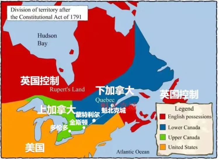 ▲加拿大省被拆分成伟上加拿大(绿)和下加拿大(蓝)