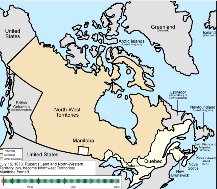 此时,英国在北美的殖民地剩下加拿大(安大略、魁北克)、新布伦瑞克、不列颠哥伦比亚、新斯科舍、西北地区等。几个地区彼此互不隶属。